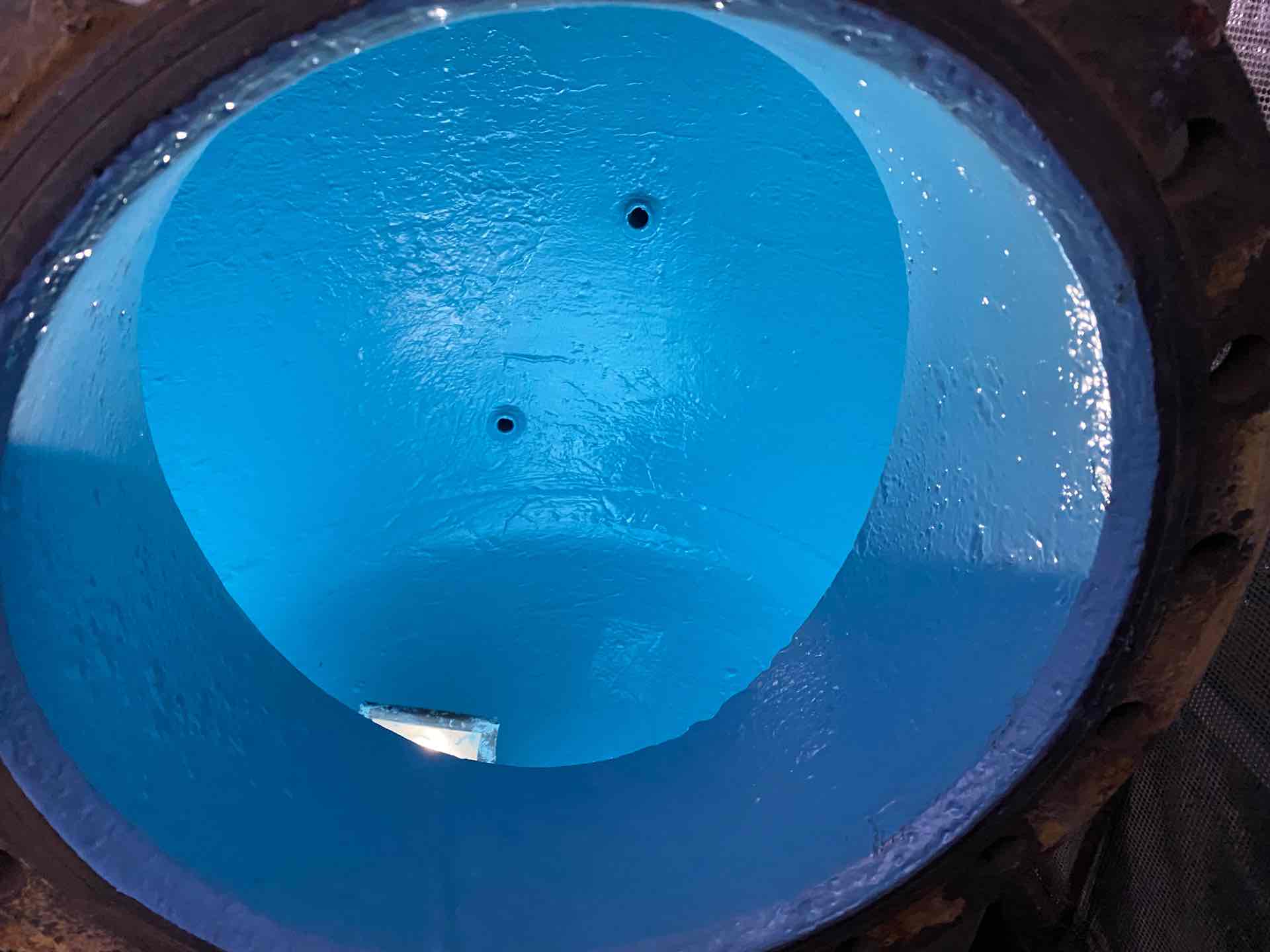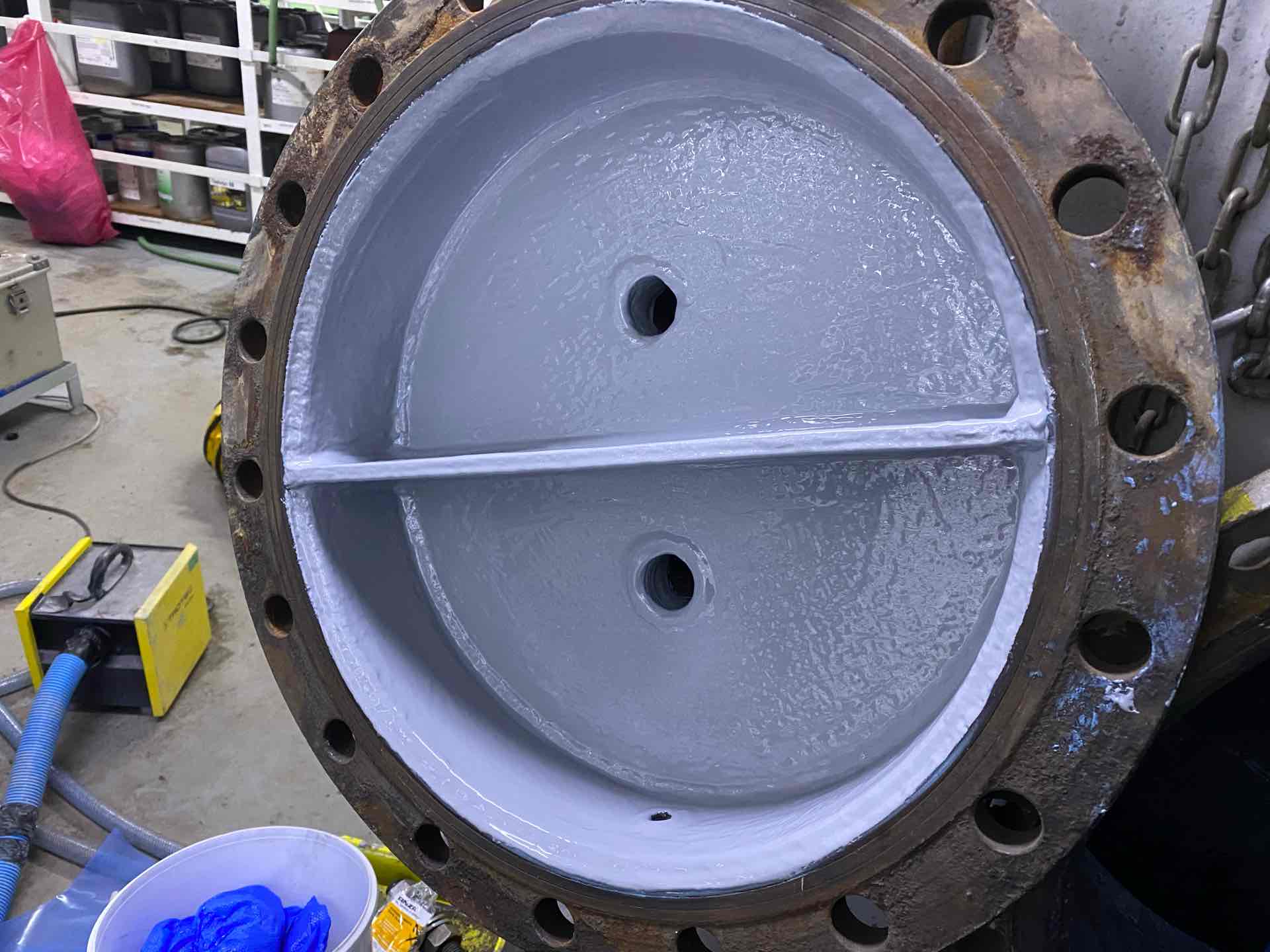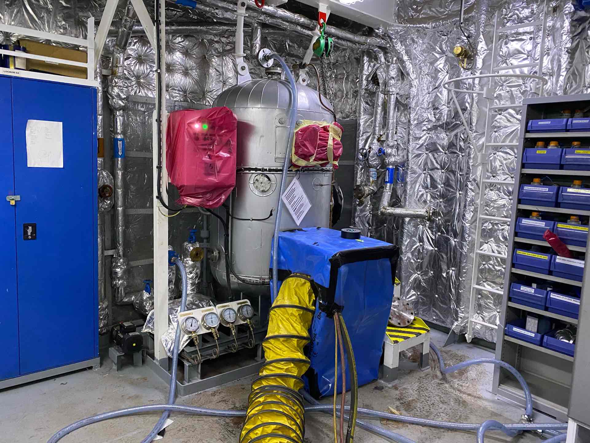 Den eksisterende coating i varmtvandsbeholderen skulle udskiftes på containerskib mens det var i dok. Eksisterende coating blæses af med støvfri Sponge Jet og der påføres herefter varmebestandig keramisk, FDA godkendt coating. Jobbet udføres på 4 dage.