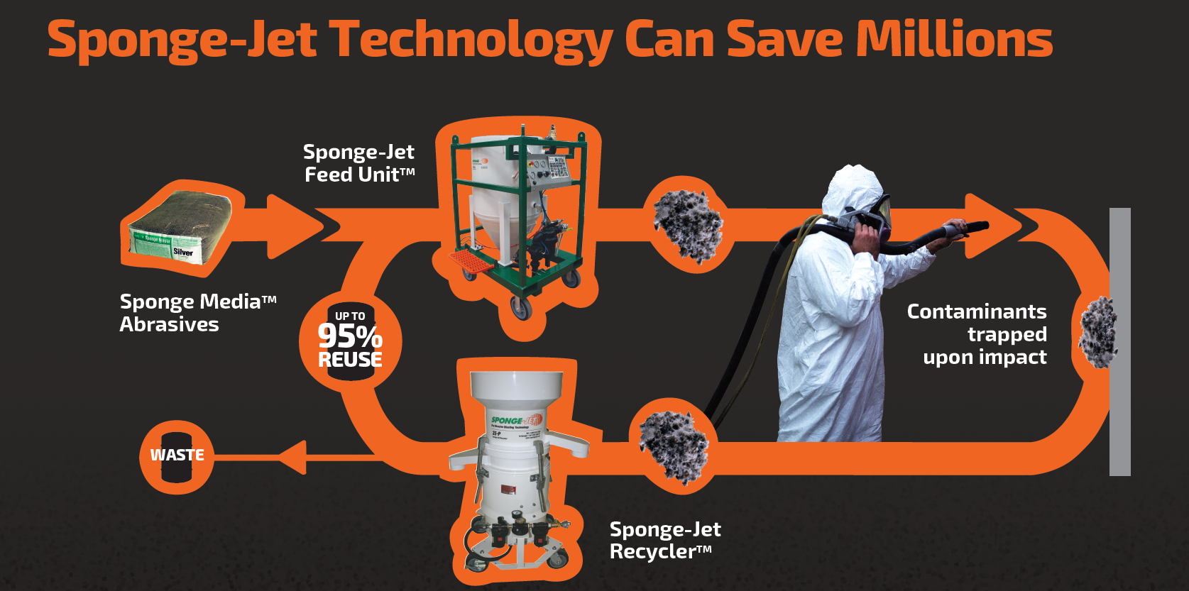 Sponge Jet kan med fordel anvendes indendørs i industrihaller, på kraftværksblokke, eller nede i tanke. Det skyldes den ringe støv udvikling, samt den fordel at blæsemidlet let kan håndteres.